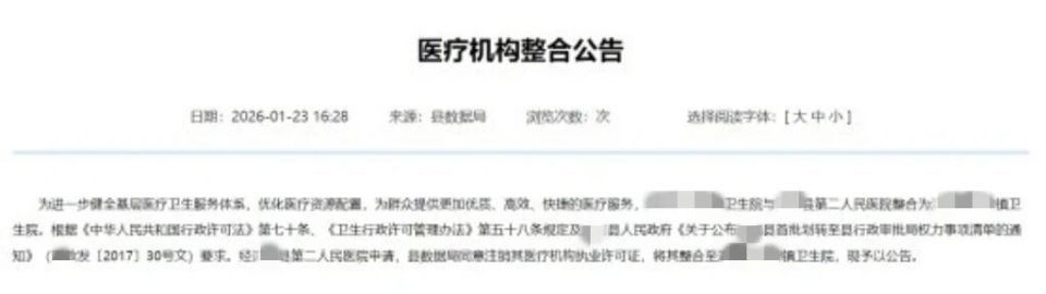 此外,基层服务能力的强化需求也促成了此次整合。根据公告,整合的目的是“健全基层医疗卫生服务体系,优化医疗资源配置”。将二级医院资源下沉,并入承担着大量基本公共卫生和常见病诊疗任务的镇卫生院,能够直接壮大基层力量。这符合国家“强基层”的医改方向,旨在让群众能在“家门口”享受到更优质的医疗服务,从而实现“小病不出镇”。